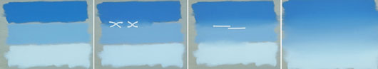 The colors are mixed on the palette and applied in their approximate location on the canvas. The brush is then dragged back and forth in a crosshatch stroke between two values until a satisfactory transition is made. Parallel strokes are then used to refine the transition of values. A clean brush is used for the dark to middle and another clean brush for the light to middle.