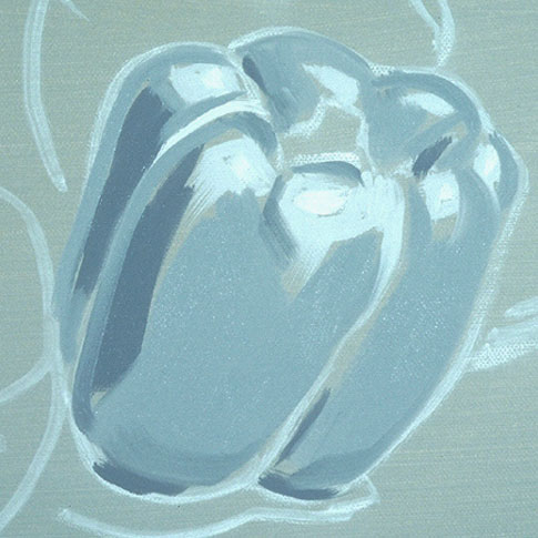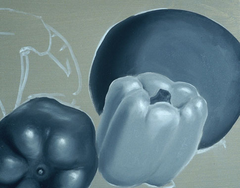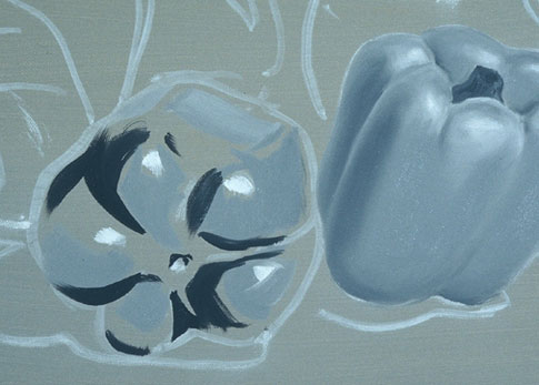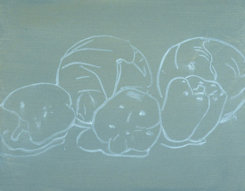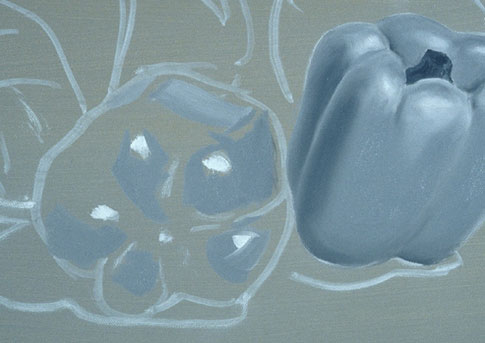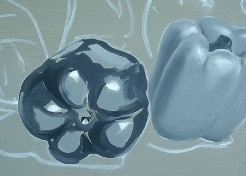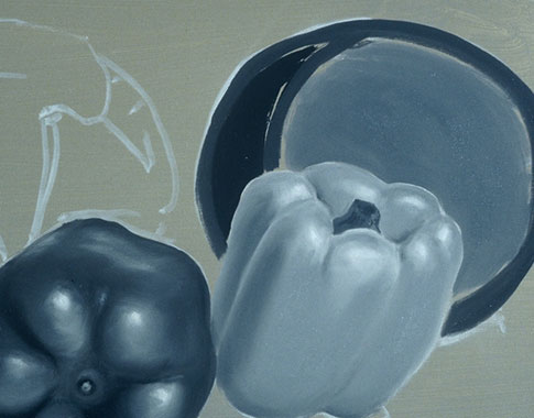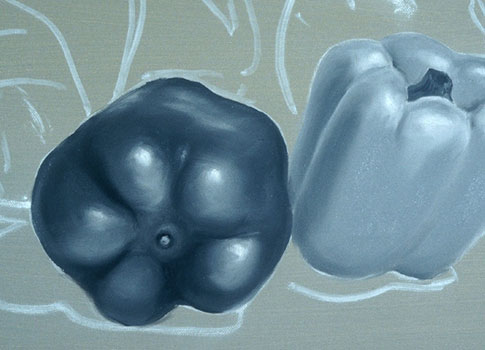 The pure white patches are the highlights. They are put in first here to keep them as clean as possible. The highlight on a shiny object is a distorted picture of its light source. The light value for this pepper is placed around the highlight and wherever else the light value appears.