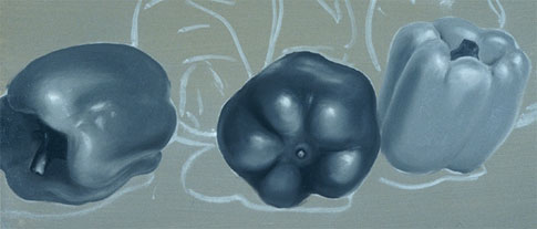 In this exercise the colors are seen only as lights and darks (or values). This painting will teach you to paint more complex forms than the previous exercise and it will teach you to see a color's value. Print out the source photo or create a colorful still life of your own to paint from.