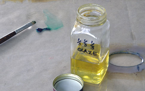 The glaze is then applied with a sable brush to the horizontal painting. Allow it to dry overnight. With a glaze you can change a color with out changing the pattern of brush strokes of the underlying layer of paint.